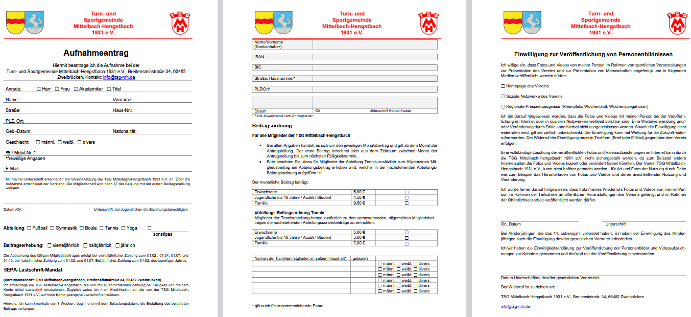 Mitgliedsantrag, Familienantrag (Paare mit gemeinsamen Wohnsitz zählen bei uns als "Familie") und Antrag auf Erteilung einer einer Spielererlaubnis (Fußball).